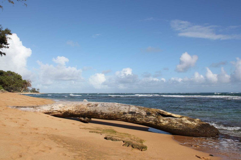A large trunk of driftwood arches a gap between sea and sand on this picturesque piece of beach near Kapaa town on Kauai. Winter time in Kapaa, when this picture was taken, means kona winds (opposite of tradewinds) blow onto the beach and the water temperature drops a few degrees.